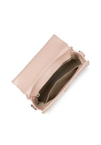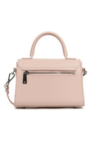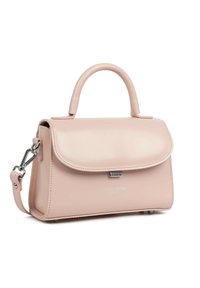 Petit sac à main rectangulaire en cuir rose pâle avec poignée arrondie, rabat avant, fermoir argenté et clips de bandoulière amovibles.