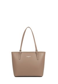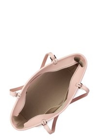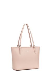 Sac fourre-tout en cuir rose clair avec deux bretelles d'épaule réglables et un petit logo embossé "Lancaster Paris" sur le devant.