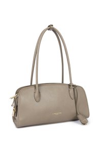 Sac à main Lancaster Paris en cuir taupe avec deux poignées supérieures et une petite étiquette en cuir attachée.