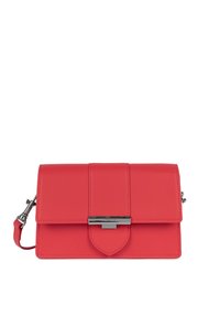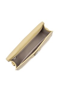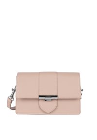 Sac bandoulière rectangulaire en cuir beige avec rabat avant, fermeture argentée, plaque métallique de marque et sangle réglable avec ferrures argentées.