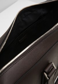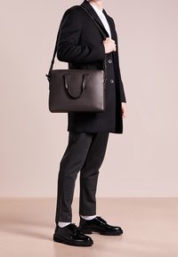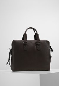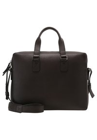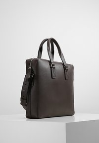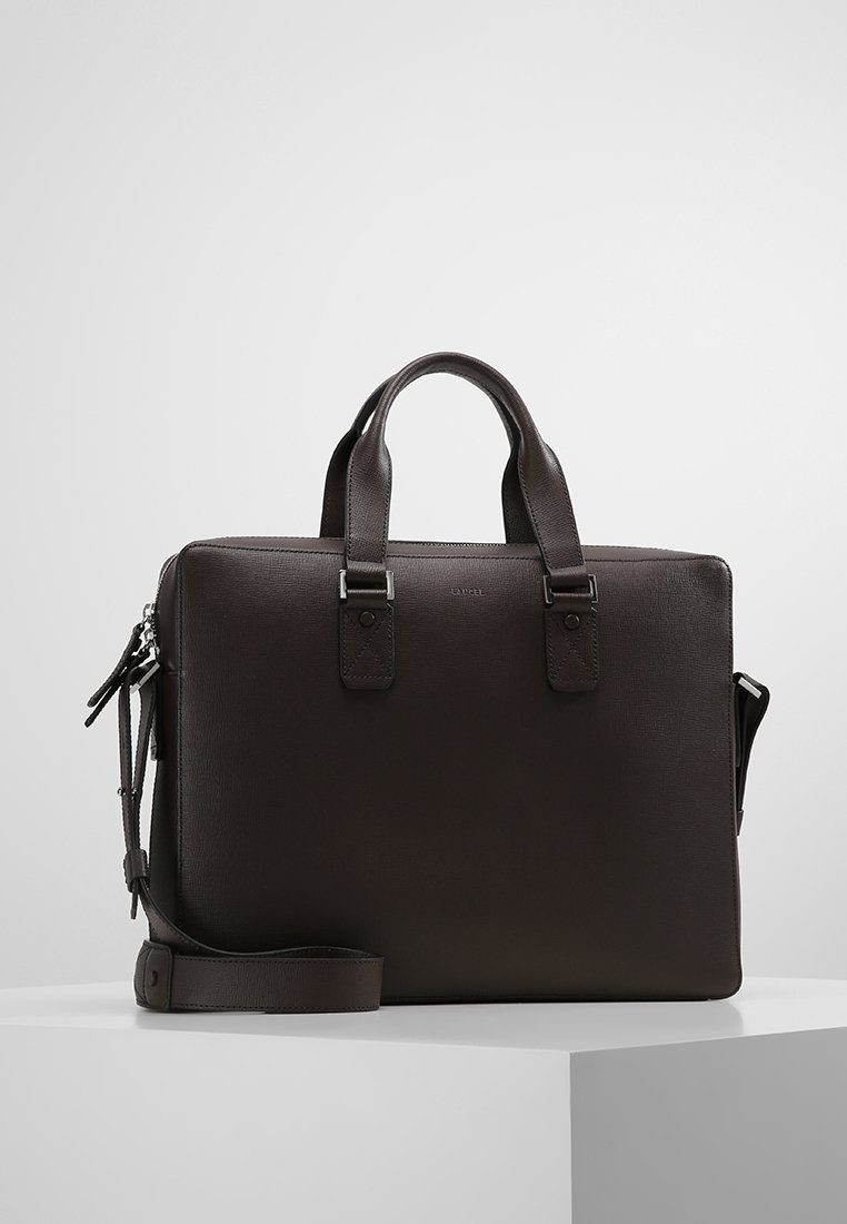 Malette en cuir brun foncé avec deux poignées supérieures et une bandoulière amovible. Texture lisse, matériel minimaliste et design rectangulaire.