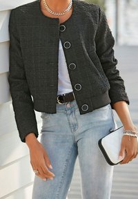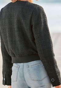 Femme portant un haut noir texturé à manches longues avec des boutons aux poignets et un jean en denim bleu clair, vue de dos.