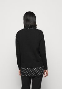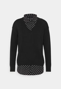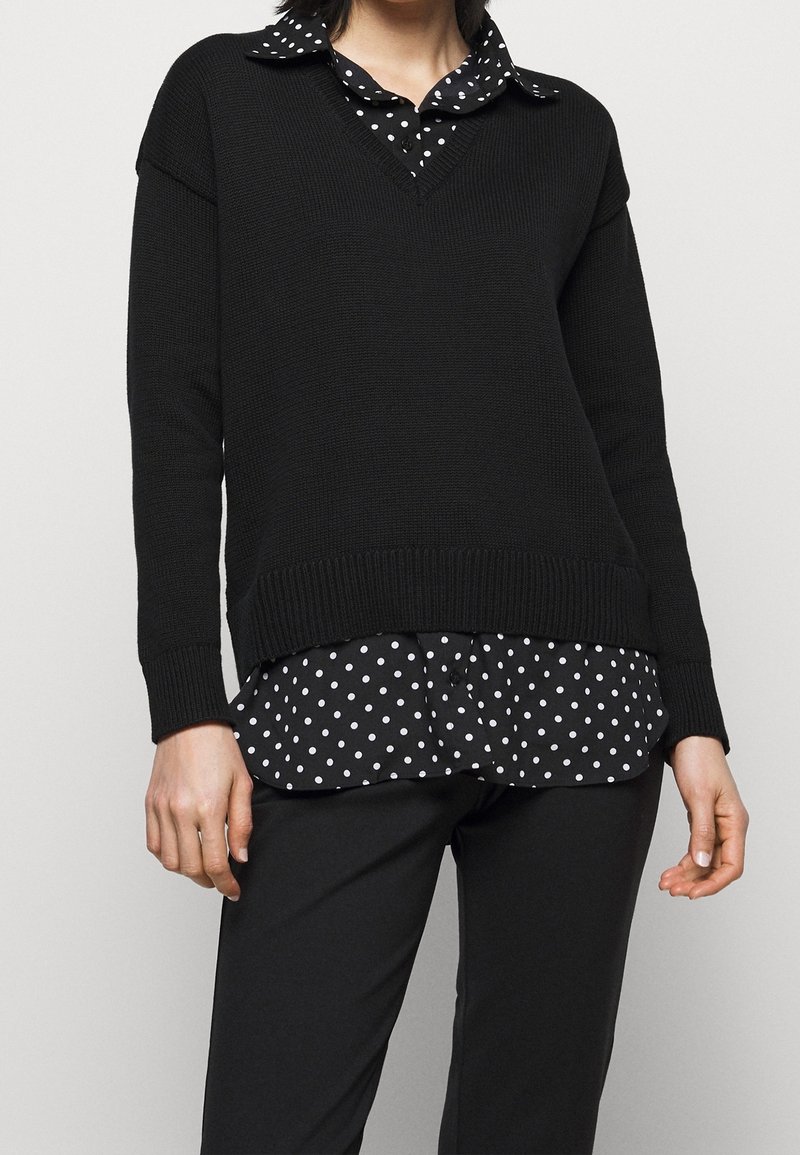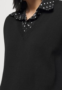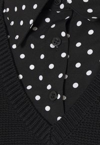 Pull noir en maille avec un col en V, porté sur une chemise noire à pois blancs. Manches longues et poignets côtelés complètent le look.