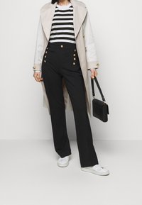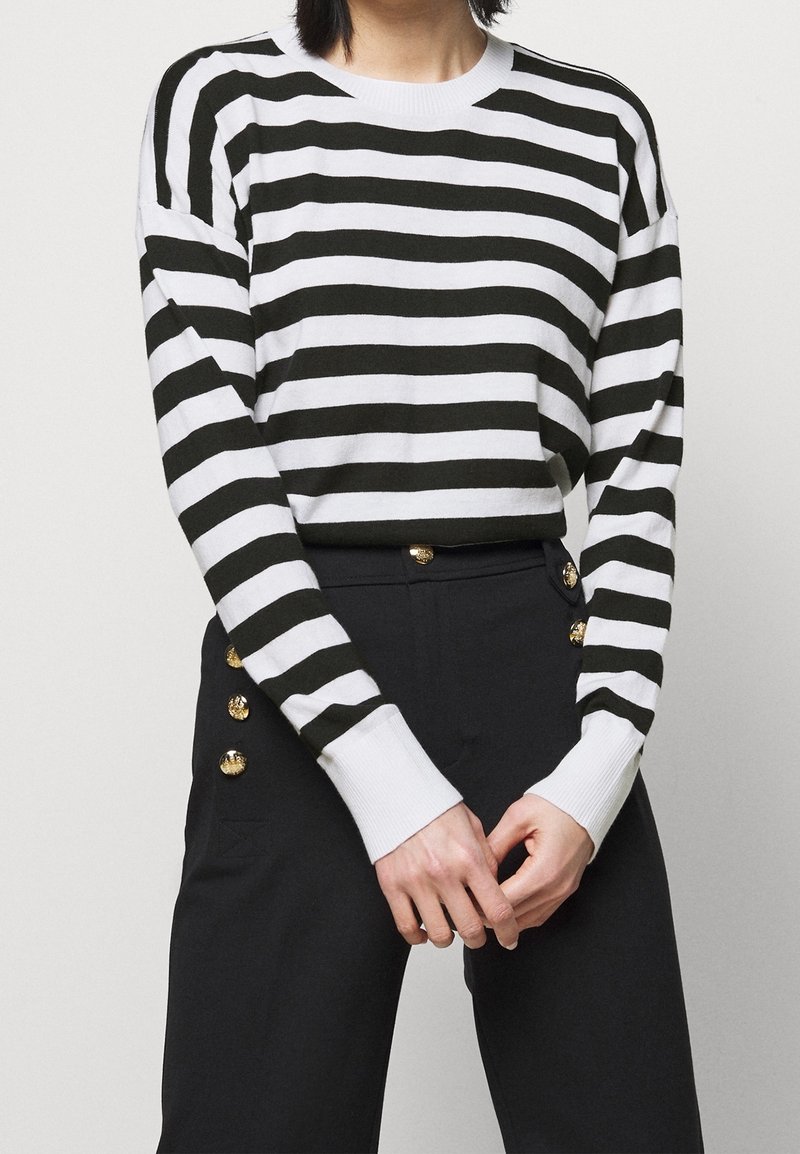 Pull en maille à rayures noires et blanches avec manches longues, poignets côtelés et coupe décontractée, associé à un pantalon noir taille haute avec des boutons dorés.