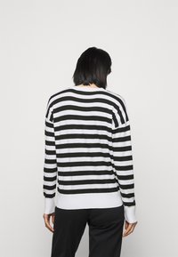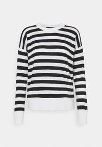 Pull en maille présentant des rayures horizontales noires et crème, col rond, manches longues avec poignets et ourlet côtelés.