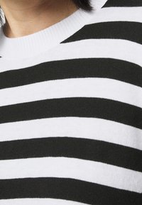 Pull en tricot côtelé noir avec des rayures blanches horizontales sur le corps et les manches, doté d'un col rond haut et de manches longues ajustées.
