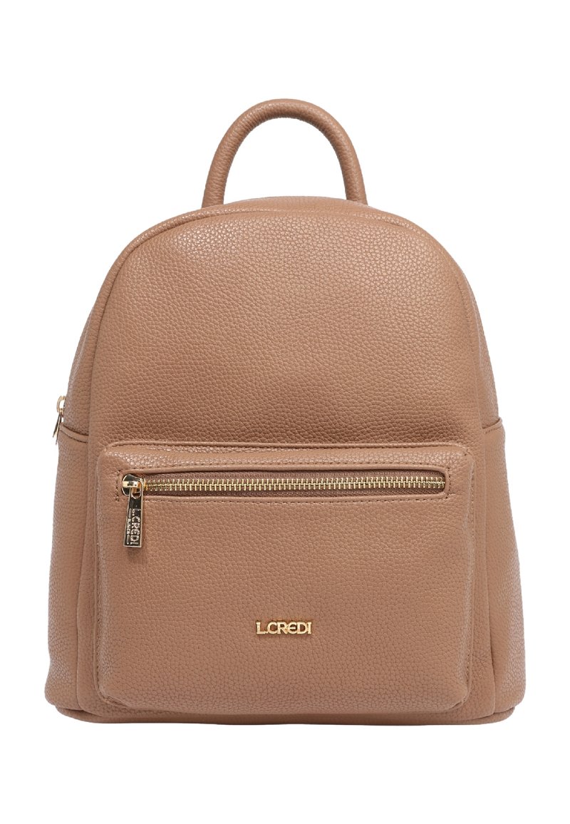 Petit sac à dos en cuir beige avec une poche avant zippée, une fermeture éclair dorée, un logo de marque et une seule poignée supérieure.