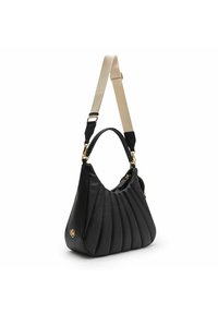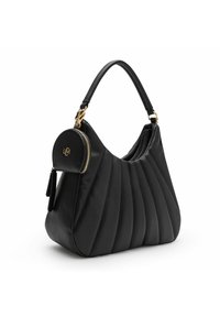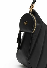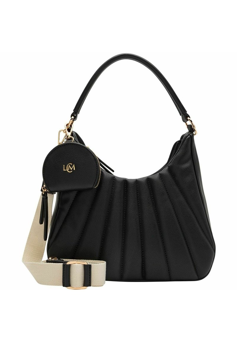 Sac à main noir texturé avec ferrures dorées, bandoulière beige amovible, et petite pochette ronde attachée à la poignée avec fermeture éclair dorée et logo.