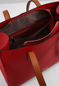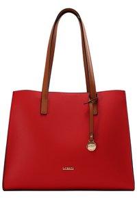 Sac à main synthétique rouge avec poignées en cuir marron, un accent logo doré et une forme rectangulaire structurée. Surface texturée avec des bords lisses.