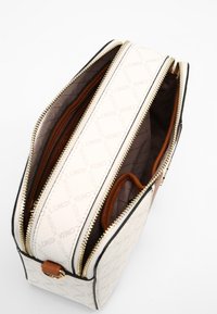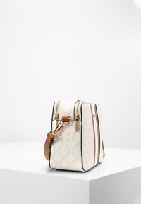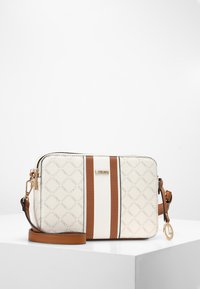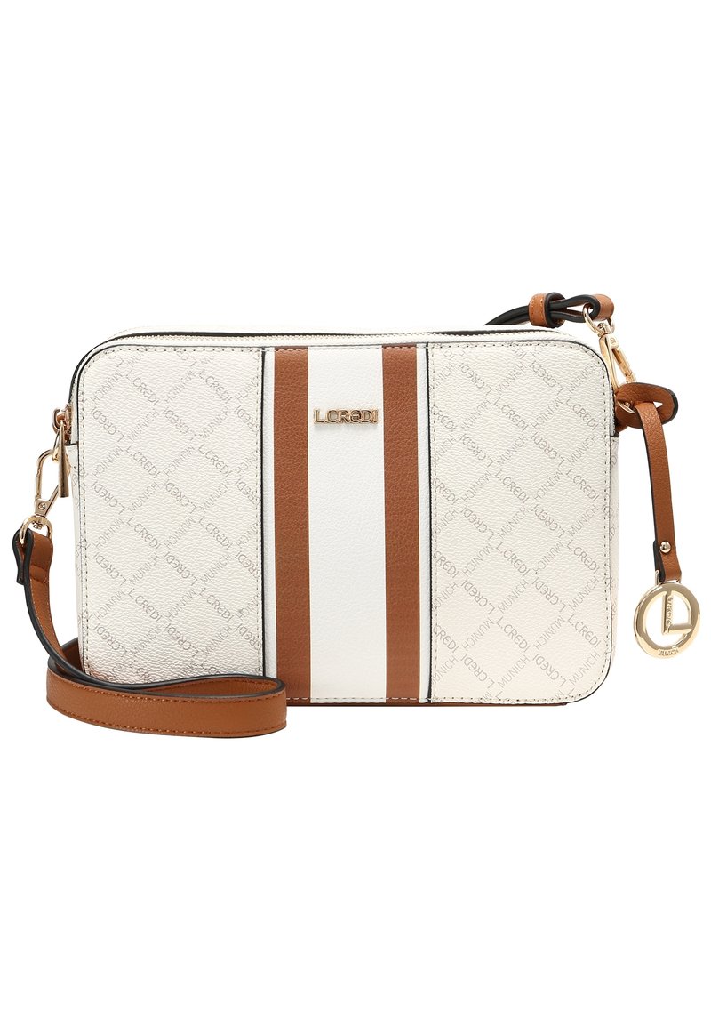 Sac bandoulière blanc et marron avec une finition texturée, arborant un logo doré, des rayures blanches et marron divisées, et une sangle ajustable.