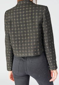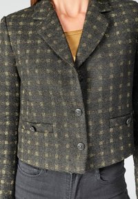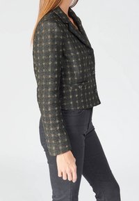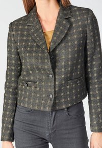 Blazer vert foncé texturé avec un motif à carreaux, fermeture à un seul bouton et revers en cranté, associé à un jean en denim gris.