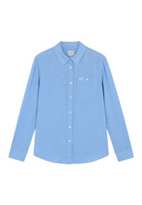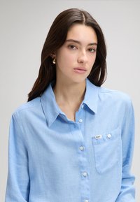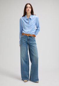Jeune femme aux longs cheveux bruns portant une chemise bleu clair à boutons, un jean bleu et une ceinture marron, posant avec une main dans la poche.