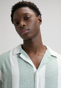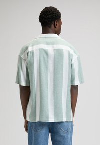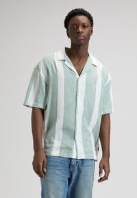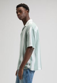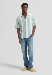 Jeune homme portant une chemise à manches courtes à rayures verticales vert clair et blanches avec des boutons, et un jean bleu, debout devant un fond uni.