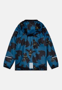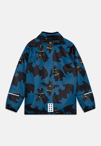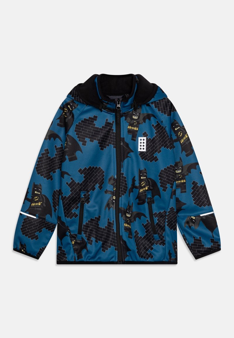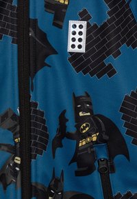 Veste bleue avec un motif Batman et briques. Design avec capuche et fermeture éclair, deux poches avant et poignets élastiques. Texture de tissu lisse.