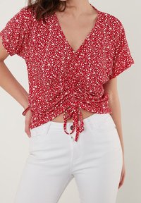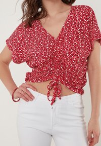 Femme portant un chemisier rouge à manches courtes florales avec un cordon devant et un jean blanc taille haute, main sur la hanche avec un bracelet assorti.