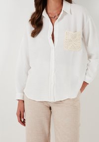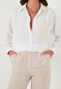 Chemise blanche à boutons, fabriquée en tissu léger, dotée d'une poche en crochet beige texturé et d'une coupe décontractée, avec des manches longues.