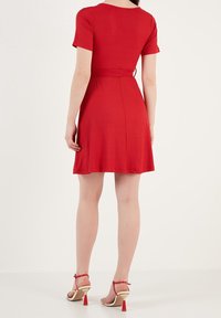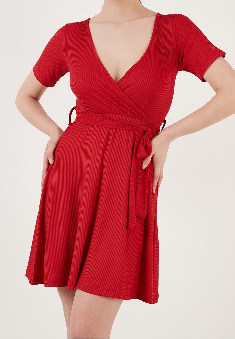 Robe enveloppante rouge en tissu côtelé avec un décolleté en V profond, des manches courtes et un détail à nouer à la taille. Jupe évasée, texture lisse.