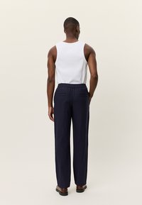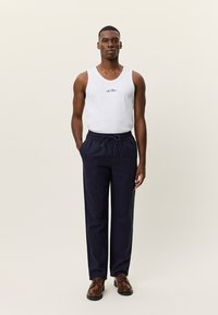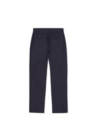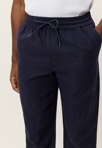 Pantalon bleu marine avec cordon de serrage en coton, coupe décontractée. Associé à des chaussures à lacets marron texturées avec une semelle robuste.