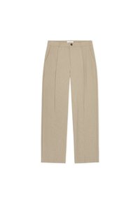 Pantalon beige plissé en tissu texturé, doté d'une fermeture à un bouton et de jambes larges, associé à des chaussures marron foncé.