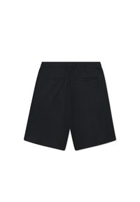 Shorts noirs ajustés avec des plis, fabriqués dans un tissu lisse. Portés avec des chaussettes beige clair et des chaussures en cuir noires. Design simple et fonctionnel.