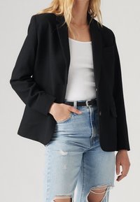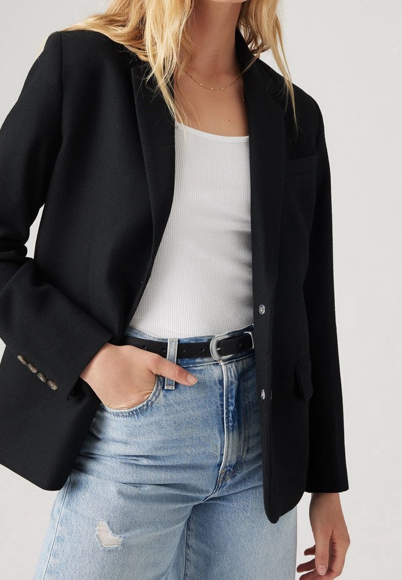 Femme portant un blazer noir sur un débardeur blanc côtelé et un jean taille haute bleu clair avec une ceinture noire, main dans la poche, fond neutre.
