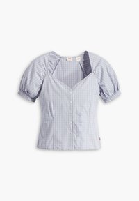 Femme portant un chemisier à carreaux lavande boutonné avec des manches bouffantes et un jean bleu ample taille haute, debout devant un fond blanc.