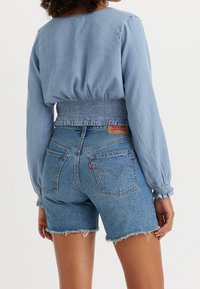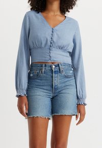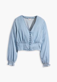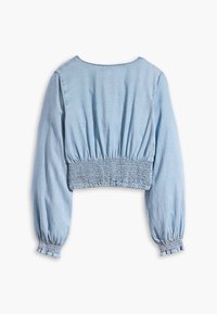 Chemise courte bleu clair avec un col en V, des manches longues et un tissu texturé. Elle présente une rangée de boutons ronds sur le devant et des poignets froncés.
