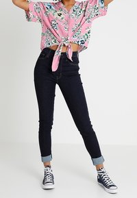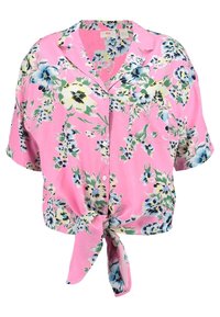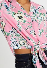 Femme portant un chemisier fleuri rose à manches courtes noué à la taille avec un jean taille haute foncé sur un fond uni.