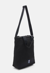 Sac noir avec marquage Levi's en turquoise et rouge. Il est doté de deux poignées, d'une bandoulière ajustable et d'une fermeture éclair. Fabriqué en toile résistante.