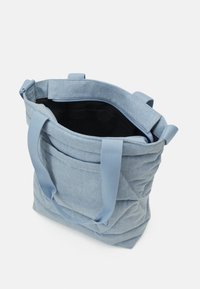 Sac cabas matelassé bleu clair avec deux poignées supérieures et une bandoulière réglable. Comprend une poche avant et un détail de logo subtil.