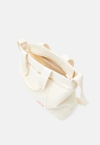 Sac fourre-tout en toile crème avec double poignée, poche avant, bandoulière réglable et logo Levi's rouge sur la poche.