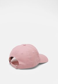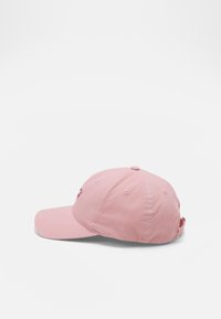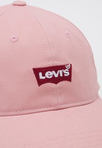 Casquette de baseball rose avec un patch logo Levi's rouge sur le devant, présentée sur un fond blanc uni.