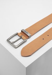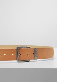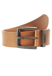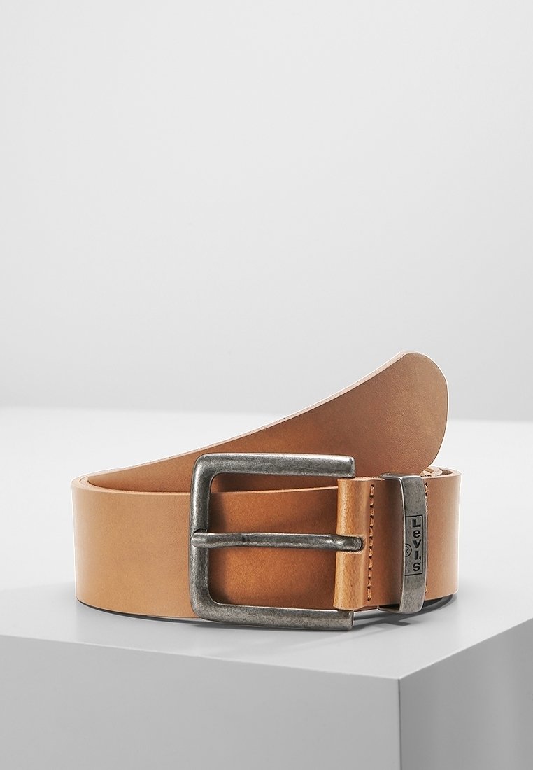 Ceinture en cuir marron clair avec une boucle rectangulaire argentée mate et « Levi's » gravé sur la passants de la ceinture, reposant sur une surface blanche.