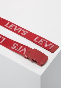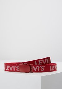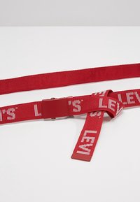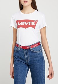 Femme portant un t-shirt blanc Levi's avec un grand logo rouge et un jean bleu avec une ceinture rouge de marque Levi's, sur un fond neutre.