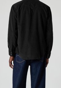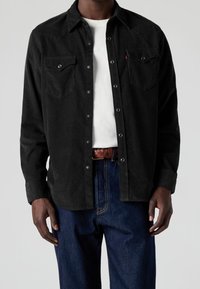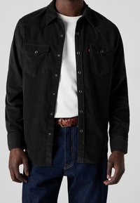Homme portant une chemise en velours côtelé noire boutonnée sur un t-shirt blanc, un jean bleu et une ceinture en cuir marron tressée, visible du cou aux hanches.