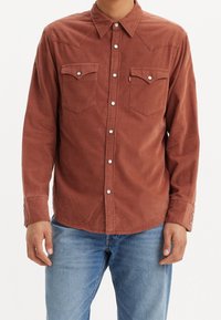 Homme portant une chemise en velours côtelé couleur rouille sur un t-shirt blanc et un jean bleu, debout devant un fond uni.