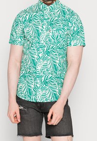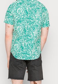 Homme portant une chemise à manches courtes à boutons avec un motif feuillu vert et blanc, et un short en denim noir déchiré.