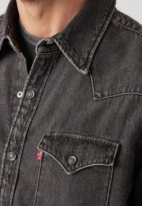 Homme portant une chemise en denim noire avec deux poches poitrine et un pantalon vert olive, debout devant un fond uni.