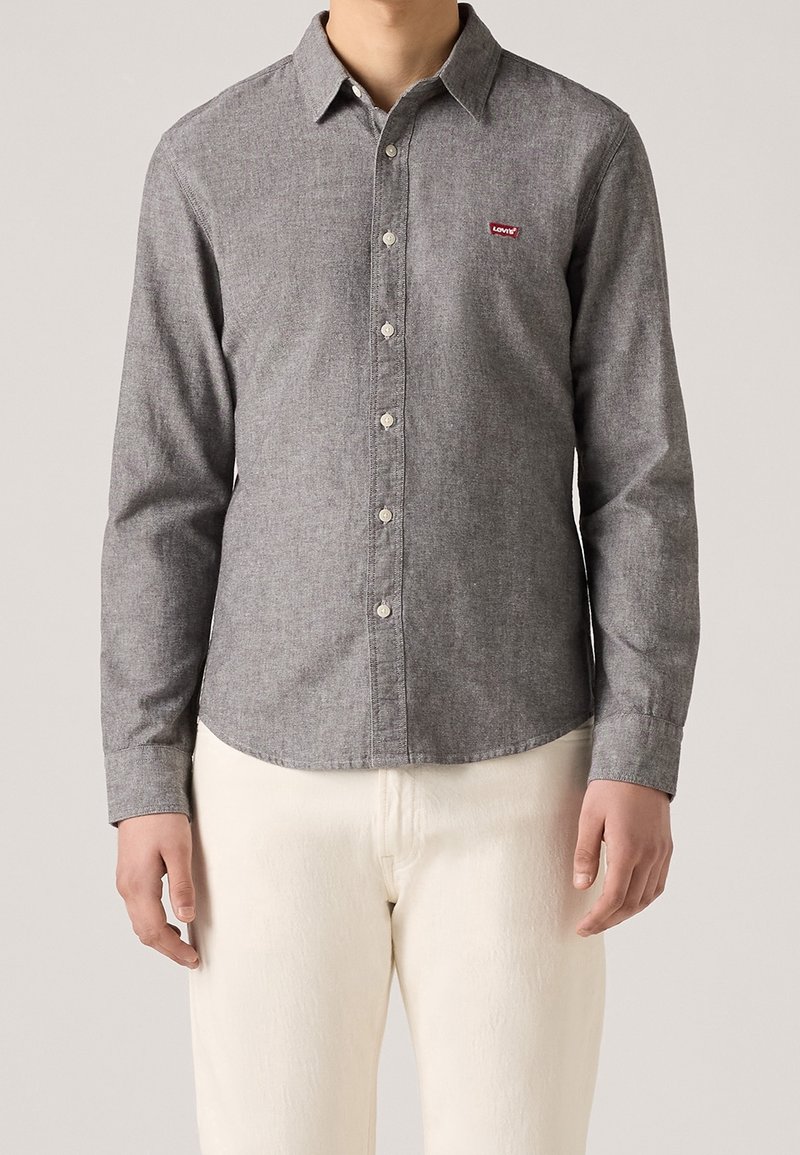Homme portant une chemise grise à manches longues boutonnée avec un petit logo rouge Levi's sur la poitrine et un pantalon écru.