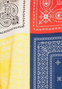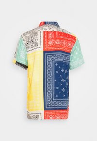 Chemise à manches courtes à boutons avec des patchs imprimés de bandanas multicolores en bleu, rouge, jaune, vert et blanc, avec une poche poitrine rouge.