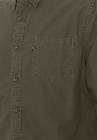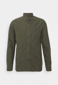 Chemise à manches longues pour hommes, couleur vert olive, boutonnée, avec col et poche poitrine, présentée sur un fond blanc uni.