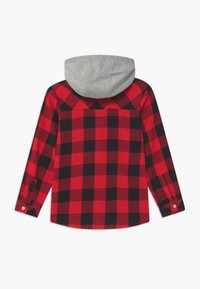 Chemise en flanelle à carreaux rouges et noirs avec manches longues, capuche grise, deux poches poitrine et fermeture par boutons. Tissu doux et motif à carreaux.