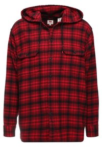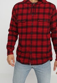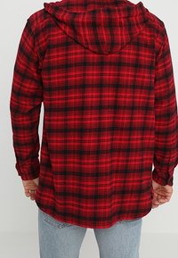 Homme portant une chemise à carreaux rouge et noire avec capuche et un jean bleu clair, debout devant un fond clair uni.