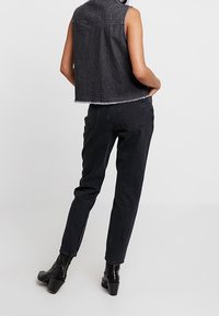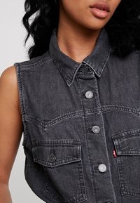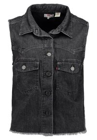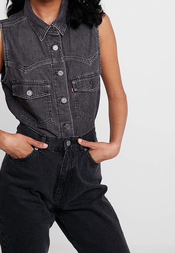Chemise sans manches en denim noir à boutons avec deux poches avant boutonnées, portée avec un pantalon en denim noir taille haute, mains dans les poches.