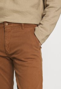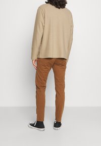 Homme portant un pantalon marron slim et des baskets montantes noires, debout devant un fond clair uni.