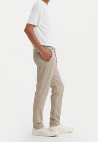 Homme portant un pantalon beige, des baskets blanches, un t-shirt blanc et une chemise à manches courtes multicolore rayée, les mains dans les poches sur fond blanc.