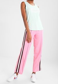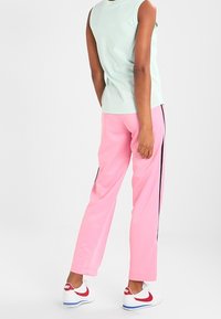 Femme portant un haut blanc sans manches Levi's et un pantalon rose vif avec des bandes noire et blanche sur le côté.