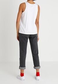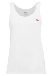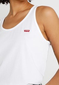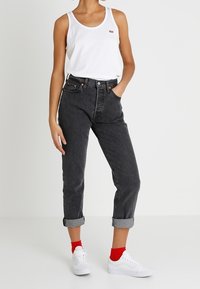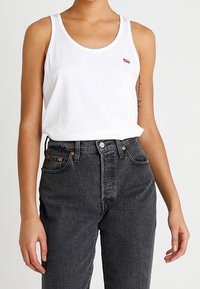 Personne portant un débardeur blanc sans manches avec un petit logo rouge et un jean noir taille haute, se tenant devant un fond uni.