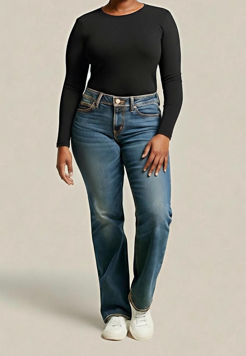 Personne portant un haut noir à manches longues, un jean bleu droit et des baskets blanches, debout devant un fond beige uni.