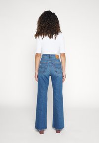 Jeans évasés en denim bleu taille haute avec un design classique à cinq poches et un léger effet usé. Portés avec des bottines marron à talons carrés.